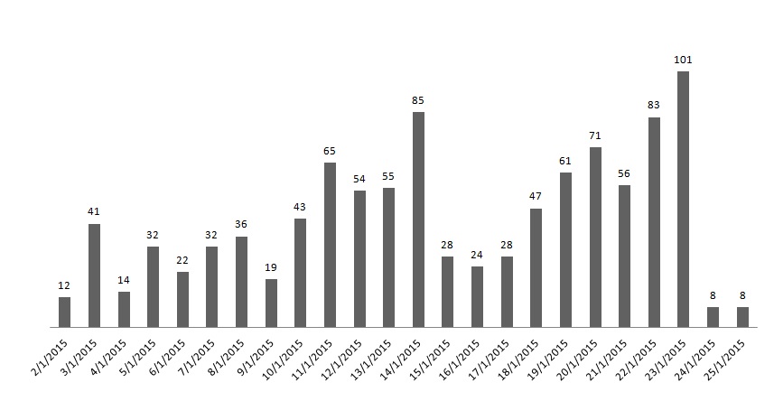 Η εγγύτητα προς τις εκλογές δείχνει να επιδρά στη συχνότητα δημοσίευσης των αναφορών με τις περισσότερες να καταγράφονται την τελευταία βδομάδα των εκλογών και ειδικότερα στις 23/1/2015 (Διάγραμμα.1). Πάντως, παρότι στα συγκεκριμένα μέσα δεν ισχύουν οι περιορισμοί που αφορούν στα τηλεοπτικά μέσα σχετικά με την απαγόρευση εμφάνισης των υποψηφίων παραμονές των εκλογών, τόσο την παραμονή όσο και την ημέρα των εκλογών, καταγράφονται οι λιγότερες αναφορές ολόκληρης της προεκλογικής περιόδου, γεγονός που ενισχύει τη θέση ότι τα μέσα κοινωνικής δικτύωσης έχουν κυρίως υποστηρικτικό ρόλο στις λοιπές προεκλογικές δραστηριότητες.