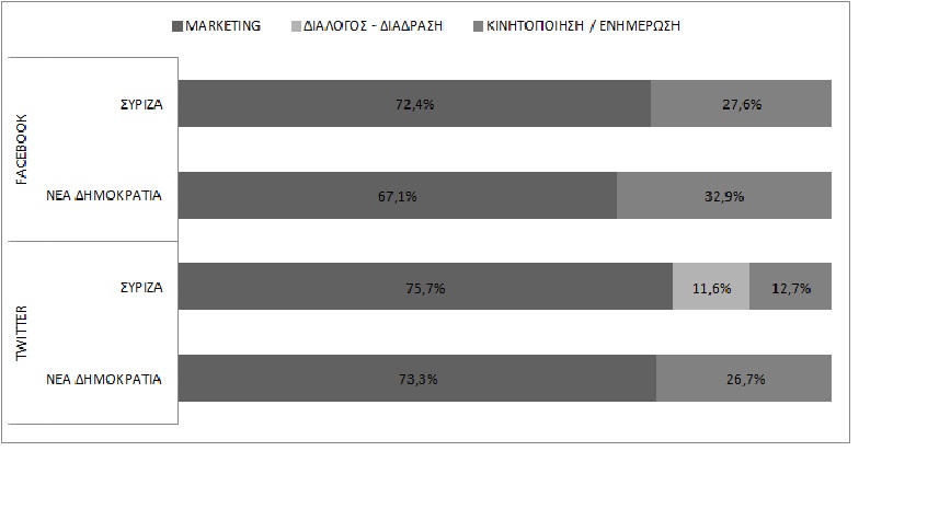 Κυρίαρχη χρήση των μέσων και για τα δυο κόμματα αναδεικνύεται η διαδικασία marketing, δηλαδή δόμηση της εικόνας, προώθησης των πολιτικών θέσεων, κριτικής και αποδόμησης της εικόνας του αντιπάλου του κόμματος (72,9%) (Διάγραμμα 2). Η προώθηση των πολιτικών θέσεων γίνεται κυρίως διαμέσου της αναπαραγωγής αποσπασμάτων του δημόσιου λόγου των αρχηγών σε πραγματικό χρόνο. Στη περίπτωση της Νέας Δημοκρατίας παρατηρείται επίσης, η χρήση των πληροφοριακών γραφημάτων (info graphics -εικόνες με αριθμητικά στοιχεία σε συνδυασμό με πληροφορία). Στην πλειοψηφία των περιπτώσεων (65%) οι αναρτήσεις παραπέμπουν, σε άλλο οπτικοακουστικό υλικό κυρίως φωτογραφίες, βίντεο ή παραπέμπουν σε άλλες πηγές όπως οι επίσημοι ιστότοποι των υποψηφίων/ κομμάτων ή σε άρθρα που ενισχύουν τις θέσεις τους. Δευτερευόντως, τα μέσα αξιοποιούνται για την προώθηση των λοιπών προεκλογικών δραστηριοτήτων (ομιλίες, δημόσιες συνεντεύξεις, περιοδείες) και για την άμεση κινητοποίηση του εκλογικού σώματος, όπου άμεσα ή έμμεσα τα κόμματα ζητούν από το κοινό τη στήριξη τους την ημέρα των εκλογών. Παράδειγμα άμεσης κινητοποίησης είναι η ανάρτηση του προέδρου του ΣΥΡΙΖΑ, στον επίσημο λογαριασμού του: «Ψηφίστε και για αυτούς τους 200.000 νέους που έφυγαν μετανάστες στο εξωτερικό & δε μπορούν τώρα να έρθουν να ψηφίσουν» (Επίσημος λογαριασμός του Προέδρου του ΣΥΡΙΖΑ στο Twitter, 22/1/2015).