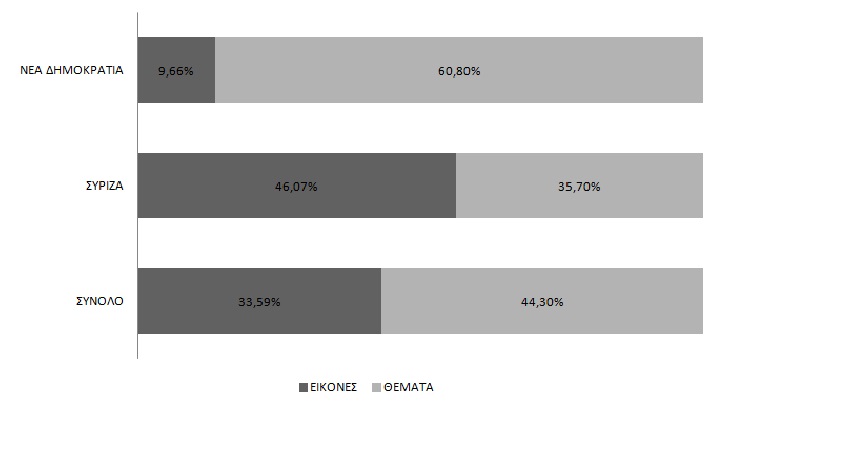 Στην προώθηση των μηνυμάτων παρατηρούνται σημαντικές διαφοροποιήσεις μεταξύ των κομμάτων. Η Νέα Δημοκρατία εστιάζει στην προώθηση των πολιτικών της θέσεων (60,8%) και λιγότερο στις εικόνες (9,6%), σε αντίθεση με το ΣΥΡΙΖΑ, ο οποίος εστίασε κατά κύριο λόγω σε εικόνες (46,1%) (Διάγραμμα 3) και λιγότερο σε θέματα (35,7%). Μάλιστα, η Νέα Δημοκρατία παρουσιάζει υψηλό βαθμό συγκεκριμενοποίησης των πολιτικών προτάσεων. Ακόμα και στην περίπτωση του Twitter, όπου υπάρχει ο περιορισμός των χαρακτήρων, αξιοποιούνται infographics προκειμένου να παρουσιαστεί τόσο το κυβερνητικό έργο, όσο και οι μελλοντικές εξαγγελίες.