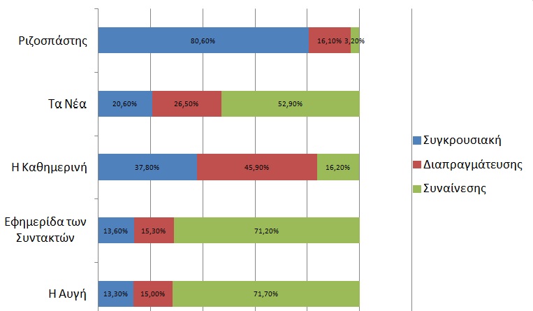 Οι εφημερίδες με αριστερό πολιτικό προσανατολισμό στο δείγμα μας, όπως «η Αυγή» και η «Εφημερίδα των Συντακτών», αλλά με εξαίρεση τον «Ριζοσπάστη», έκαναν χρήση της «συναινετικής» πλαισίωσης. Η εφημερίδα που κινείται στον πολιτικό χώρο του κέντρου, «τα Νέα», τήρησαν μια πιο ουδέτερη στάση. Αντίθετα η εφημερίδα με κεντροδεξιό προσανατολισμό, η «Καθημερινή», έκανε κυρίως χρήση της συγκρουσιακής και πλαισίωσης διαπραγμάτευσης. Η εφημερίδα του ΚΚΕ