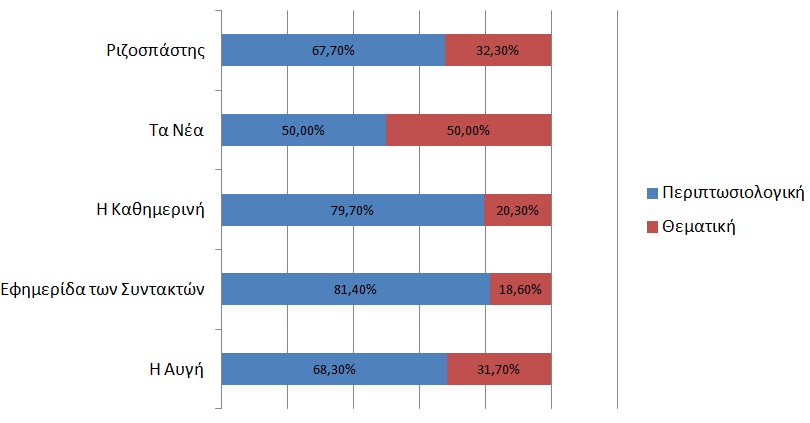 Η εφημερίδα «Τα Νέα» τήρησε την πιο ουδέτερη στάση κάνοντας χρήση «περιπτωσιολογικής» και «θεματικής» πλαισίωσης με ίδια ποσοστά (βλ. Διάγραμμα 2).