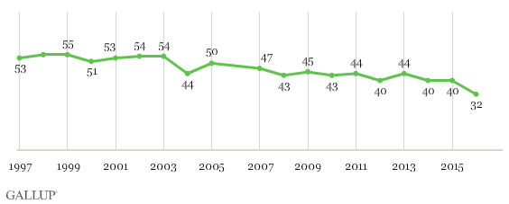 Σύμφωνα με διαχρονική έρευνα της εταιρείας Gallup (2016), την τελευταία δεκαπενταετία η εμπιστοσύνη των Αμερικανών απέναντι στην ικανότητα των Μέσων ενημέρωσης «να μεταδίδουν τις ειδήσεις πλήρως, με ακρίβεια και δίκαια» εμφανίζει φθίνουσες τάσεις. Το υψηλότερο ποσοστό εμπιστοσύνης (72%) καταγράφηκε το 1976, ενώ από το 2007 μέχρι σήμερα κυμαίνεται σταθερά κάτω από το 50%. Το χαμηλότερο ποσοστό καταγράφηκε το 2015 με μόλις 32% των Αμερικανών να δηλώνουν ότι «έχουν μεγάλη ή αρκετή εμπιστοσύνη στα μέσα ενημέρωσης». Η φθίνουσα πορεία της εμπιστοσύνης των πολιτών παρατηρείται σε όλες τις ηλικίες, αλλά το ποσοστό εμπιστοσύνης είναι ακόμα χαμηλότερο κυρίως μεταξύ των νέων (ηλικίας 18-49 ετών) (Swift, 2016).