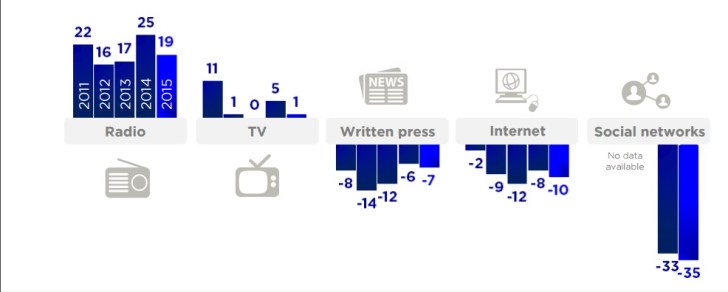 Σύμφωνα με την EBU (2016: 7), παρόμοια εικόνα φθίνουσας εμπιστοσύνης του κοινού απέναντι στα Μέσα ενημέρωσης παρατηρείται και στην Ευρώπη. Το 2015 η εμπιστοσύνη του κοινού μειώθηκε σε όλο το εύρος των Μέσων. Η τηλεόραση και το ραδιόφωνο επλήγησαν περισσότερο, ενώ ο Τύπος, το διαδίκτυο και τα κοινωνικά δίκτυα εμφάνισαν μικρή πτώση. Παρόλα αυτά, για τους Ευρωπαίους τα ραδιοτηλεοπτικά Μέσα εξακολουθούν να είναι τα πιο αξιόπιστα σε αντίθεση με τον Τύπο και τα διαδικτυακά Μέσα (διαδίκτυο και κοινωνικά δίκτυα), που εμφανίζουν μέτρια ή υψηλά ποσοστά αναξιοπιστίας αντιστοίχως. Το ραδιόφωνο θεωρείται το πιο αξιόπιστο Μέσο σε 20 χώρες, ενώ η τηλεόραση σε 13 χώρες.