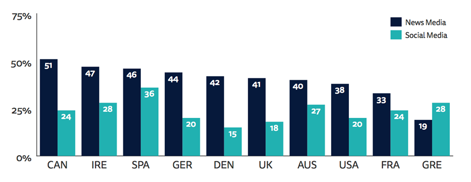 Γράφημα 1: Ποσοστό, το οποίο συμφωνεί ότι τα Ειδησεογραφικά Μέσα / τα Κοινωνικά Μέσα βοηθούν επιτυχώς στο διαχωρισμό του γεγονότος (fact) από τη μυθοπλασία (fiction) – Επιλεγμένες χώρες.