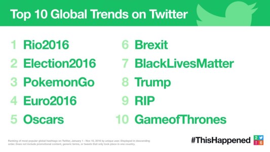Το Twitter απαριθμεί πάνω από 310 εκατομμύρια ενεργούς χρήστες μηνιαίως[iv]. Όσον αφορά στη χρήση των hashtags και τα δημοφιλή θέματα για το έτος 2016, το δημοφιλές κοινωνικό δίκτυο ξεκίνησε την καμπάνια #thishappened σχετικά με πιο δημοφιλή trends για το έτος, όπως παρουσιάζονται στο παρακάτω πίνακα[v].