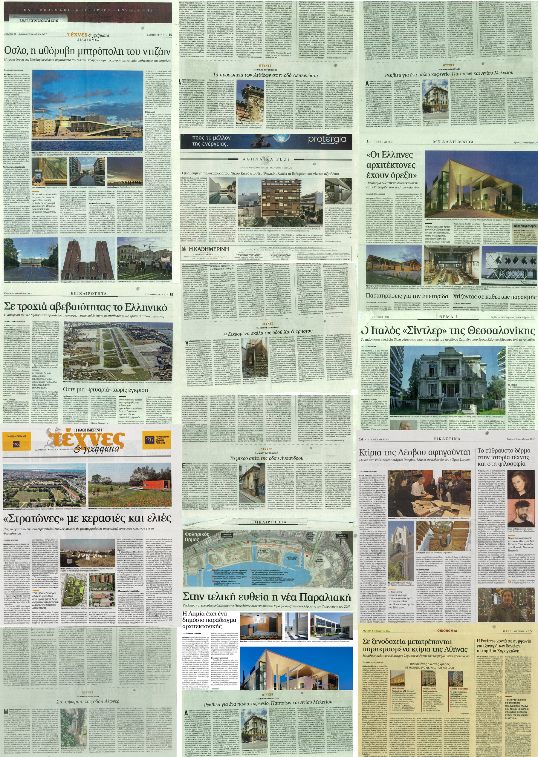 Στο σημείο αυτό παρατίθενται τα αποτελέσματα της καταγραφής των σχετικών με την Αρχιτεκτονική δημοσιευμάτων που εντοπίστηκαν στις προαναφερθείσες 4 εφημερίδες (ΤΑ ΝΕΑ, ΤΟ ΒΗΜΑ, Η Καθημερινή, Η Εφημερίδα των Συντακτών), στις παράλληλες διαδικτυακές τους εκδόσεις και στους 4 ιστότοπους (news247, iefimerida, Athens Voice, LIFO) για το προαναφερθέν ενδεικτικό χρονικό διάστημα (23/09-05/12/2017).