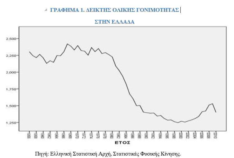 Στην Ελλάδα ο δείκτης γονιμότητας παίρνει καθοδική πορεία από τα μέσα της δεκαετίας του ΄60 και μετά, παρόλα αυτά η δραματική πτώση έρχεται από την δεκαετία του ΄80 και έπειτα όπου και υπάρχει μια παγίωση του (Κοτζαμάνης & Σοφιανοπούλου, 2008). Όπως φαίνεται από το γράφημα 1, ο δείκτης σταδιακά άρχισε να υποχωρεί σε τιμές κατώ των 2 παιδιών ανά γυναίκα με αποκορύφωμα τα ιστορικά χαμηλά που σημειώνονται στις μέρες μας, της τάξης του 1,3 παιδιά ανά γυναίκα. Η σταδιακή πτώση από τα μέσα της δεκαετίας του ΄60 οφείλεται κυρίως τα μαζικά κύματα μετανάστευσης προς το εξωτερικό (Goldin, et al., 2011). Ωστόσο η κατακόρυφη πτώση που συμβαίνει από τις αρχές της δεκαετίας του 1980 είναι αυτή που προκαλεί ιδιαίτερη εντύπωση, αλλά μπορεί να ερμηνευτεί αν υπολογιστεί το γεγονός ότι κατά τη διάρκεια αυτής της δεκαετίας η γυναίκα αρχίζει και ανεξαρτητοποιείται. Ο ρόλος της αναβαθμίζεται συγκριτκά με τα προηγούμενα χρόνια και αρχίζει να διεκδικεί ολοένα και περισσότερο χώρο στην κοινωνία και στην αγορά εργασίας. Αυτό λειτουργεί ανασταλτικά στην επιθυμία για απόκτηση παιδιών, αφού οι προτεραιότητες της πλέον είναι διαφορετικές. Στο ίδιο συμπέρασμα καταλήγει και η Συμεωνίδου (1986), αναφέροντας ότι η εργασία των γυναικών, η έλλειψη χρόνου και οι οικονομικοί παράγοντες είναι οι λόγοι που εμποδίζουν την απόκτηση τέκνων. Μία μικρή ανάκαμψη του δείκτη ολικής γονιμότητας παρατηρείται στα χρόνια από το 2004 μέχρι το 2009, με την κάθε γυναίκα να αποκτά από 1,5 παιδιά και πάνω και αυτό το χαρακτηριστικό είναι μάλλον απόρροια της γενικότερης οικονομικής ανάπτυξης που συνόδευε εκείνη την εποχή και αντανακλάται και στον αριθμό των γεννήσεων. Φτάνοντας στη σημερινή εποχή, η οποία έχει σημαδευτεί από τις συνέπειες της βαθιάς οικονομικής ύφεσης, η γονιμότητα μειώθηκε εκ νέου, αγγίζοντας επίπεδα που αποτελούν τα χαμηλότερα στην ιστορία της Ελλάδας (1,3 παιδιά ανά γυναίκα).