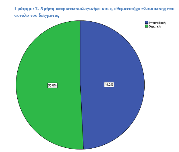 Σχετικά με το ερευνητικό ερώτημα της χρήσης «περιπτωσιολογικής» και «θεματολογικής» πλαισίωσης στα δημοσιεύματα που αναλύθηκαν, τα αποτελέσματα δείχνουν ότι στο σύνολο του δείγματος η «περιπτωσιολογική» και η «θεματική» πλαισίωση χρησιμοποιούνται περίπου με την ίδια συχνότητα. Όπως φαίνεται από το παρακάτω γράφημα, τo 50,8% των δημοσιευμάτων πλαισιώνεται «θεματολογικά», ενώ το 49,2% «επεισοδιακά».