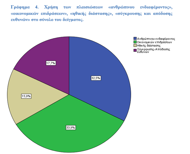 Αναφορικά με το ερευνητικό ερώτημα της χρήσης πλαισιώσεων «ανθρώπινου ενδιαφέροντος», « οικονομικών επιδράσεων», «ηθικής διάστασης», «σύγκρουσης και απόδοσης ευθυνών» στο συνολικό δείγμα, παρατηρούμε στο παρακάτω γράφημα ότι τα περισσότερα δημοσιεύματα (33,9%) εστιάζουν στις οικονομικές επιδράσεις του δημογραφικού προβλήματος, ενώ ακολουθούν τα δημοσιεύματα που πλαισιώνουν με ανθρωπιστικό τρόπο το περιεχόμενό τους (32,5%), τα δημοσιεύματα σύγκρουσης -απόδοσης ευθυνών (17,7%) και αυτά της ηθικής διάστασης (15,9%).
