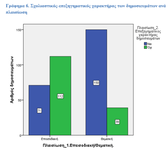 Oι επτά από τις εννιά ιστοσελίδες (zougla.gr, protothema.gr, iefimerida.gr, newsit.gr, kathimerini.gr, tovima.gr, και efsyn.gr) φιλοξενούν άρθρα που στην πλειονότητα τους παρέχουν επεξηγήσεις σχετικά με το δημογραφικό πρόβλημα. Μόνο οι δύο από τις υπό εξέταση ιστοσελίδες (news247.gr και naftemporiki.gr) περιλαμβάνουν άρθρα που ως επί το πλείστο δεν έχουν επεξηγηματικό-σχολιαστικό χαρακτήρα. Έτσι, αυτό που γίνεται κατανοητό και με την βοήθεια του παρακάτω γραφήματος, είναι το γεγονός ότι ο σχολιαστικός χαρακτήρας των δημοσιευμάτων συνδέεται με την θεματική πλαισίωση των δημοσιευμάτων. Φαίνεται ότι από τα 189 δημοσιεύματα που είναι πλαισιωμένα θεματικά, τα 150 έχουν επεξηγηματικό χαρακτήρα. Από την άλλη πλευρά, από τα 183 επεισοδιακά πλαισιωμένα δημοσιεύματα τα 71 από αυτά παρουσιάζουν επεξηγηματικό-σχολιαστικό χαρακτήρα.