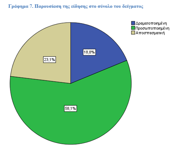 Στο σύνολο του δείγματος τώρα, η παρουσίαση της είδησης που κυριαρχεί είναι αυτή της προσωποποιημένης σε ποσοστό 58,1% όπως φαίνεται και από το παρακάτω γράφημα. Ακολουθεί ο αποσπασματικός τρόπος παρουσίασης με 23,1% και ο προσωποποιημένος με 18,8%. Οι ειδήσεις που εστιάζουν στο δημογραφικό δηλαδή παρουσιάζονται στον κοινό με τρόπο που οικοδομεί σχέσεις μεταξύ δημοσιογράφου και δέκτη κυρίως. Αναλύοντας τα υπό εξέταση δημοσιεύματα, γίνεται σαφές ότι η προσωποποιημένη παρουσίαση των ειδήσεων που αφορούν το δημογραφικό, χρησιμοποιείται κατά κόρον εξαιτίας της σοβαρότητας του φαινομένου. Η αποσπασματική παρουσίαση των σχετιζόμενων ειδήσεων δεν είναι τόσο μεγάλη, επειδή μιλάμε για ένα κοινωνικό πρόβλημα με πολλαπλές προεκτάσεις. Παράλληλα ούτε και ο δραματοποιημένος τρόπος χρησιμοποιείται ιδιαίτερα αφού όπως διαπιστώθηκε τα δημοσιεύματα προσπαθούν να «μιλήσουν» στο κοινό χωρίς να γίνει υπερβολική επίκληση στο συναίσθημα του.