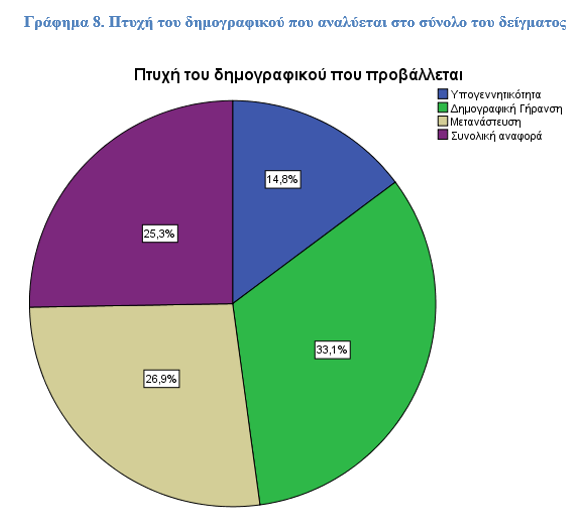 Καταλήγοντας στο τελευταίο ερώτημα της έρευνας, παρατηρήθηκε ότι συνολικά το 33,1% των δημοσιευμάτων του δείγματος αναφέρεται στην δημογραφική γήρανση, το 26,9% στη μετανάστευση, το 25,3% αναφέρονται συνολικά στο φαινόμενο, ενώ μόλις το 14,8% των δημοσιευμάτων εστιάζει στην υπογεννητικότητα. Η γήρανση είδαμε ότι συνδέεται άμεσα με το οικονομικό πρόβλημα της χώρας και πιο συγκεκριμένα την εξάντληση των πόρων των ασφαλιστικών ταμείων και τις περικοπές στις συντάξεις. Αν αναλογιστεί κανείς ότι η οικονομική και η μεταναστευτική κρίση βρίσκονται στην κορυφή των ειδήσεων της επικαιρότητας τα τελευταία χρόνια, είναι λογικό να υπάρχει αυτή η συγκεκριμένη αναλογία στις πτυχές του δημογραφικού που αναλύονται.