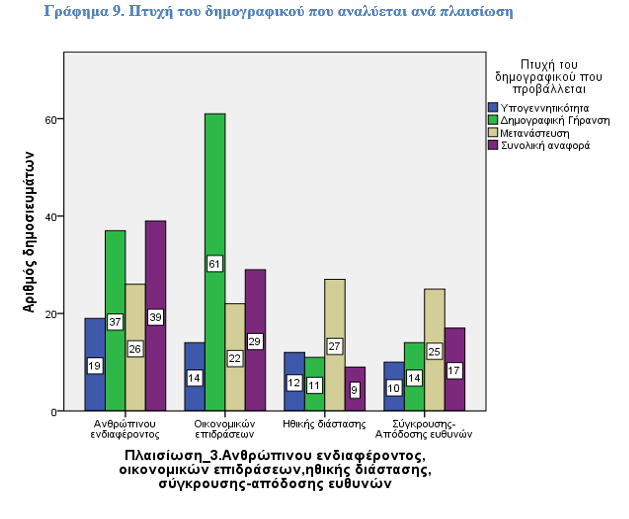 Είναι ορατό και στα συγκεντρωτικά στοιχεία του παρακάτω γραφήματος ότι η γήρανση του πληθυσμού αναλύεται κυρίως στα δημοσιεύματα που βλέπουν το δημογραφικό πρόβλημα από την οπτική γωνία των οικονομικών επιδράσεων. Στα δημοσιεύματα ανθρώπινου ενδιαφέροντος η συνολική απεικόνιση του προβλήματος και η δημογραφική γήρανση εμφανίζονται περίπου στην ίδια συχνότητα, ενώ στα δημοσιεύματα ηθικής διάστασης και σύγκρουσης-απόδοσης ευθυνών, εμφανίζεται περισσότερο η πτυχή της μετανάστευσης. Η προβολή των πτυχών του δημογραφικού δεν είναι ισότιμη εκ μέρους των ιστοσελίδων με την γήρανση να απεικονίζεται περισσότερο ως άμεση συνέπεια της οικονομικής κρίσης και των περικοπών των συντάξεων που αυτή έφερε. Ακολουθούν η μετανάστευση, η συνολική καταγραφή του προβλήματος και τέλος το πρόβλημα των μειωμένων γεννήσεων.