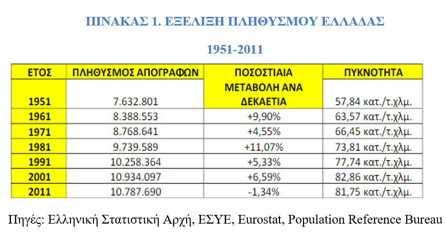 Με βάση τα στοιχεία από Ελληνική Στατιστική Αρχή (πρώην ΕΣΥΕ), Eurostat και Population Reference Bureau, όπως αυτά αποτυπώνονται στον πίνακα 1, γίνεται κατανοητό ότι ο πληθυσμός της Ελλάδας από το 1951 μέχρι και το 2001[2] παρουσιάζει αυξητική τάση, ωστόσο στην τελευταία απογραφή του 2011 παρατηρείται μείωση της ποσοστιαίας μεταβολής του πληθυσμού συγκριτικά με την προηγούμνη δεκαετία (Μπαλούρδος, Ντόντης & Σπυροπούλου 2006). Αυτές οι αυξομοιώσεις του πληθυσμού είναι συνδεδεμένες με τρεις βασικούς παράγοντες. Αυτοί είναι: η γονιμότητα, η θνησιμότητα και η μετανάστευση και ο καθένας διαδραματίζει τον δικό του ξεχωριστό ρόλο στη διαμόρφωση ενός πληθυσμού.