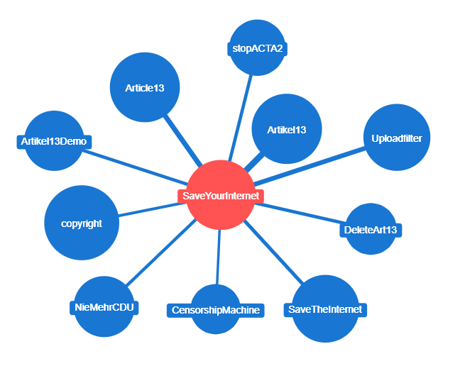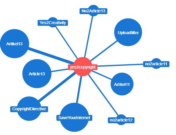 Όπως βλέπουμε και στο γράφημα παρακάτω, το #Yes2Copyright χρησιμοποιήθηκε αρκετά από το αντίπαλο στρατόπεδο, καθώς συνδυάζεται με τα #no2Article13, #no2article11 και #SaveYourInternet. Μόνο το #Yes2Creativity υποδηλώνει tweets υποστηρικτικά ως προς την Οδηγία.