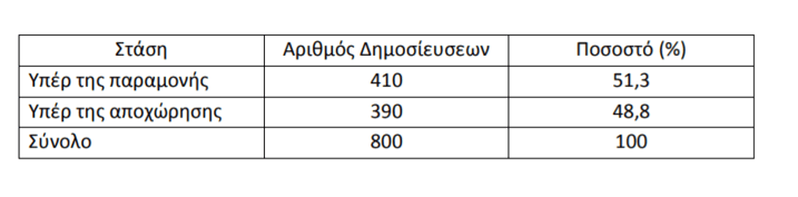 Πίνακας 1: Ποσοστό δημοσιεύσεων στις σελίδες των εργατικών σωματείων και των επαγγελμαυτικών ομάδων «βάσης» στο Facebook σχετικά με την παραμονή της Βρετανίας στην ΕΕ
