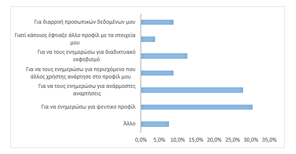 Οι λόγοι που ήρθαν σε επαφή με κάποιον αρμόδιο ήταν, κατά μέσο όρο, για να αναφέρουν κάποιο ψεύτικο προφίλ που εντόπισαν (30,4%), ανάρμοστες αναρτήσεις (27,8%), διαδικτυακό εκφοβισμό (12,7%), ανάρμοστο περιεχόμενο που άλλος χρήστης ανάρτησε στο δικό τους προφίλ (8,9%), για διαρροή των προσωπικών τους δεδομένων (8,9%), καθώς και για να αναφέρουν ότι κάποιος έφτιαξε νέο προφίλ με τα δικά τους στοιχεία (3,8%) ή άλλους λόγους (7,6%).