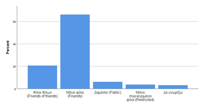 Σχετικά με τις ρυθμίσεις ιδιωτικότητας, το 66,1% των ερωτώμενων φοιτητών έχουν επιλέξει τη ρύθμιση ιδιωτικότητας «Φίλοι», το 20,7% το «Φίλοι φίλων», το 6,2% «Δημόσιο», δηλαδή ορατό σε όλους, το 3,8% «Περιορισμένο» και μόλις το 3,2% δε γνωρίζουν τι ρύθμιση έχουν στο προφίλ τους. Αυτά αναδεικνύουν ότι, στην πλειοψηφία τους, οι φοιτητές έχουν κάποιας μορφής συνειδητοποίηση ως προς την προστασία της ιδιωτικής τους ζωής.