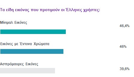 Εξετάζοντας τα είδη της εικόνας που προτιμούν οι Έλληνες χρήστες του Instagram, στην πρώτη θέση βρίσκονται οι μίνιμαλ εικόνες (46,4%), ακολουθούν οι εικόνες με έντονα χρώματα (46%), οι ασπρόμαυρες εικόνες (39,6%) και τέλος, οι μονόχρωμες εικόνες (17,7%).