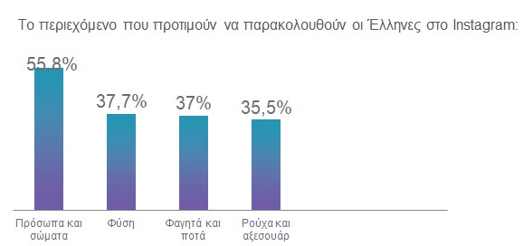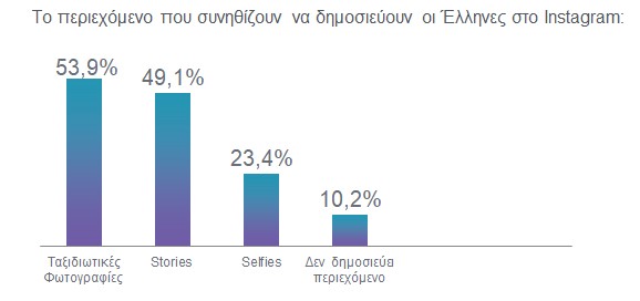 Όσον αφορά το περιεχόμενο το οποίο συνηθίζουν να δημοσιεύουν στο Instagram, διαπιστώνεται ότι το περιεχόμενο που σχετίζεται με την καθημερινή και προσωπική ζωή είναι το επικρατέστερο. Συγκεκριμένα, το 53,9% των Ελλήνων συνηθίζει να δημοσιεύει ταξιδιωτικές φωτογραφίες, το 49,1% stories από την καθημερινή του ζωή και τέλος, το 23,4% selfies φωτογραφίες.
