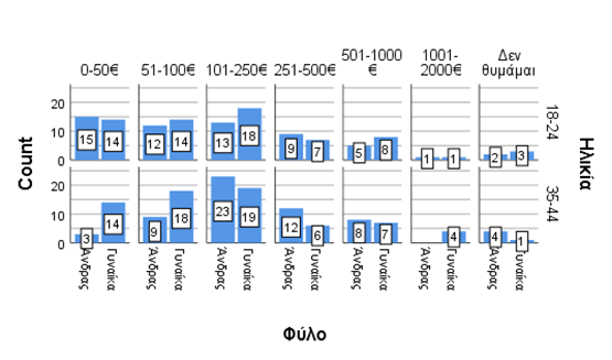 Τα χρήματα που ξοδεύτηκαν τους τελευταίους 12 μήνες σε διαδικτυακές αγορές, διαχωρισμένα ανά ηλικία και ανά φύλο. Φαίνεται πως από τα άτομα που εντάσσονται στις ηλικιακές κατηγορίες που συμμετείχαν στην έρευνα, (250 συνολικά) το μεγαλύτερο ποσοστό των ανθρώπων (73 άτομα) τους τελευταίους 12 μήνες έχουν ξοδέψει 101-250 ευρώ (€). Στην συνέχεια έπονται εκείνοι που έχουν δαπανήσει 51-100€ (53 άτομα), 0-50€ (46 άτομα), 251-500€ (34 άτομα) 501-1000€ (28 άτομα) και 1001-2000€ (6 άτομα). Σε κάποια αντίστοιχη έρευνα προγενέστερης χρονολογίας ίσως τα ευρήματα να ήταν εμφανώς διαφοροποιημένα, κι αυτό προκύπτει από την αυξημένη χρήση του διαδικτύου τα τελευταία χρόνια. (Γράφημα 1).