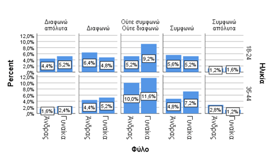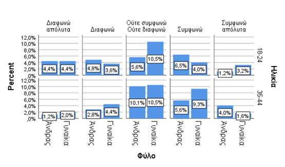 Η έρευνα πραγματοποιήθηκε μέσω ερωτηματολογίων τα οποία μοιράστηκαν και συμπληρώθηκαν από όλες τις ηλικιακές ομάδες και ενώ έγινε καταγραφή όλων των ερωτηματολογίων, επιλέχθηκαν να αναλυθούν τα ερωτηματολόγια που εμπίπτουν στις δύο ηλικιακές ομάδες δηλαδή 18-24 και 35-44. Συμμετείχαν συνολικά 116 άνδρες (46,4%) και 134 γυναίκες (53,6%), ενώ οι συμμετέχοντες της κάθε ηλικιακής ομάδας ανέρχονται στις 122 (48,8%) και 128 (51,2%) εγγραφές.