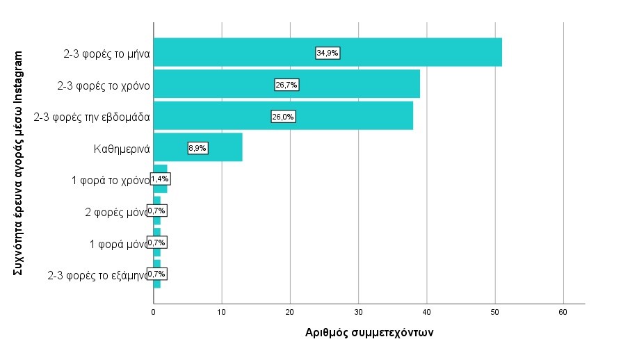 Ακόμη, διαπιστώθηκε ότι υπερτερούν με μικρή διαφορά όσοι ψάχνουν ή αγοράζουν μέσω Instagram. Οι περισσότεροι φαίνεται να αναζητούν είδη μόδας και ομορφιάς και είδη σπιτιού, ενώ η συχνότητα κυμαίνεται από δύο με τρεις φορές την εβδομάδα έως δύο με τρεις φορές το χρόνο. Από τα ευρήματα δεν έγινε ξεκάθαρο αν η επιρροή των influencers στις αγοραστικές διαθέσεις των καταναλωτών είναι ισχυρή. Ερμηνεύοντας τη μικρή αύξηση που παρουσιάζουν οι αρνητικές απαντήσεις σε σχέση με τις θετικές, φαίνεται πως οι αγορές των χρηστών του Instagram δεν επηρεάζονται από τα brands που οι influencers προωθούν ή έχουν. Αξίζει βέβαια να αναφερθεί ότι η αγορά στο Instagram βρίσκεται σε ανάπτυξη και αυτό γίνεται αντιληπτό από τους χρήστες, όπως φυσικά και η σημασία της πλατφόρμας ως επιχειρηματικό εργαλείο και η συμβολή της στις προοπτικές ανάπτυξης της γυναικείας επιχειρηματικότητας στο ψηφιακό περιβάλλον.
