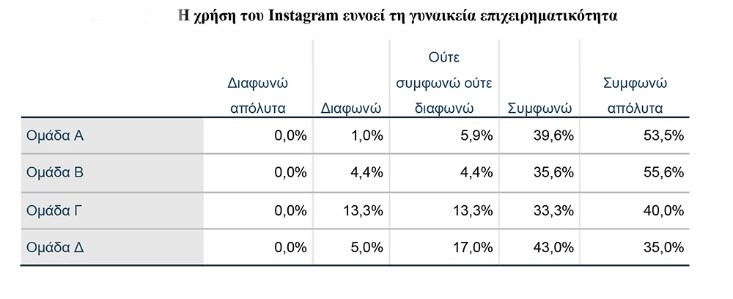 Πολύ σημαντικά ευρήματα υπήρξαν επίσης στις ερωτήσεις που αφορούσαν την επιχειρηματικότητα και το Instagram. To 62,4% της Ομάδας Α, το 55,6% της Ομάδας Β, το 46,7% της Ομάδας Γ και το 33% της Ομάδας Δ πιστεύουν ότι το IG έδωσε πρόσβαση στους επιχειρηματίες σε ευρύτερο καταναλωτικό κοινό. Σύγκλιση απόψεων παρουσιάστηκε και στα ερωτήματα αν η πλατφόρμα του Instagram ευνοεί τις επιχειρήσεις εν γένει αλλά και την γυναικεία επιχειρηματικότητα που ήταν και το επίκεντρο αυτής της μελέτης. To 51,5% της Ομάδας Α, το 51,1% της Ομάδας Β, το 40% της Ομάδας Γ και το 31% της Ομάδας Δ πιστεύουν ότι η χρήση Instagram ευνοεί τις επιχειρήσεις. Ακόμα, τo 53,5% της Ομάδας Α, το 55,6% της Ομάδας Β, το 40% της Ομάδας Γ και το 35% της Ομάδας Δ πιστεύουν ότι η χρήση Instagram ευνοεί τη γυναικεία επιχειρηματικότητα.
