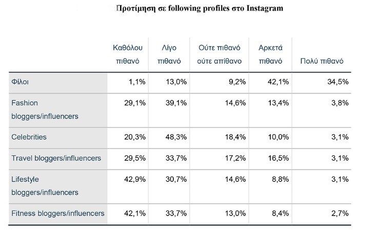 Η επόμενη ενότητα ερωτήσεων προσέφερε δεδομένα που αφορούσαν τα προφίλ που οι χρήστες επιλέγουν να ακολουθήσουν στο Instagram και τους λόγους για τους οποίους το κάνουν. Από τα δεδομένα προέκυψε ότι οι χρήστες ακολουθούν πρωτίστως τους λογαριασμούς των φίλων τους, με το 42,1% να δηλώνει ότι ακολουθεί αρκετούς φίλους και το 34,5% πάρα πολλούς. Υπενθυμίζεται ότι οι Blight et al (2017) ανέφεραν ότι οι χρήστες του Instagram παρουσιάζουν πιο ισχυρά κίνητρα κοινωνικής αλληλεπίδρασης και συντροφικότητας, παρατήρηση που επιβεβαιώνεται κι από τα στοιχεία της παρούσας έρευνας. Από τις υπόλοιπες κατηγορίες λογαριασμών που δόθηκαν ως επιλογές, οι συμμετέχοντες παρουσίασαν πολύ χαμηλά επίπεδα θαυμασμού για τους influencers ή τους celebrities. Αν μπορεί να διακριθεί κάποια προτίμηση ανάμεσα σε ποσοστά που δεν έφτασαν το 20% και σε κάποιες περιπτώσεις ούτε και το 10%, είναι οι travel bloggers/influencers. Συγκεκριμένα, το 16,5% απάντησε ότι τους ακολουθεί αρκετά και το 17,2% ούτε λίγο ούτε πολύ. Αντίστοιχα, τα ποσοστά για τους fashion bloggers/influencers ήταν 13,4% και 14,6% και για τους celebrities 10% και 18,4%. Τελευταίοι στην κατάταξη προτίμησης ήρθαν οι lifestyle bloggers/influencers και οι fitness bloggers/influencers.
