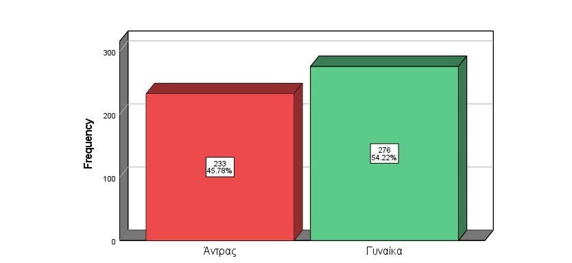 Από το σύνολο των 509 ατόμων που συμμετείχαν στη μελέτη, οι 233 είναι άνδρες και οι 276 γυναίκες, με ποσοστά 45.78% και 54.22% του συνολικού δείγματος, αντίστοιχα.