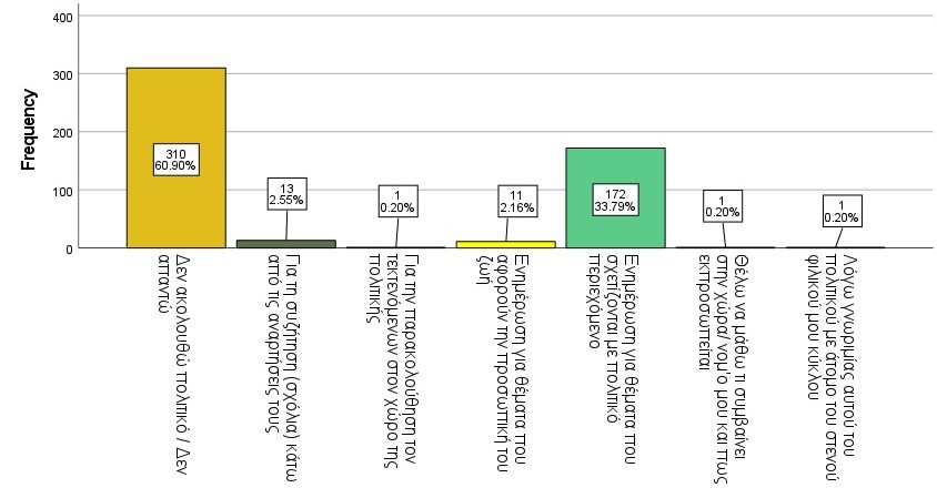 Οι 310 ή το 60.90% είτε δεν «ακολουθούν» πολιτικό στα ΜΚΔ, είτε δεν απάντησαν ποιος είναι ο κύριος λόγος που «ακολουθούν» πολιτικούς στα ΜΚΔ. Από όσους απάντησαν, οι 13 ή το 2.55% ενδιαφέρονται για τη συζήτηση/σχόλια κάτω από τις αναρτήσεις των πολιτικών, ένας (0.20%) για να παρακολουθεί τα τεκτενόμενα στο χώρο της πολιτικής, 11 ή το 2.16% επειδή επιθυμούν να ενημερώνονται για θέματα που αφορούν την προσωπική ζωή των πολιτικών, 172 ή το 33.79% ακολουθούν πολιτικούς στα ΜΚΔ γιατί επιθυμούν να ενημερώνονται για θέματα που σχετίζονται με πολιτικό περιεχόμενο, ένας (0.20%) γιατί θέλει να μαθαίνει τι συμβαίνει στη Χώρα/ Νομό του και πως εκπροσωπείται και ένας (0.20%) λόγω γνωριμίας του πολιτικού με πρόσωπο του άμεσου περιβάλλοντός του.
