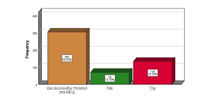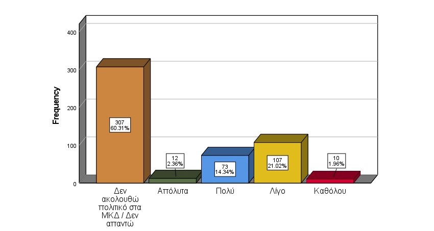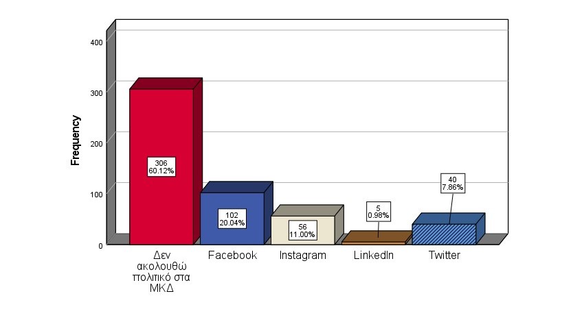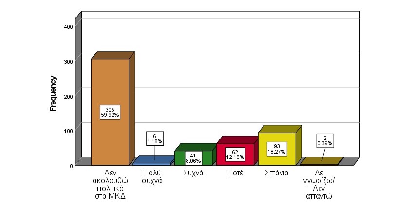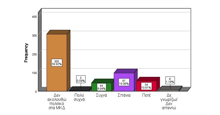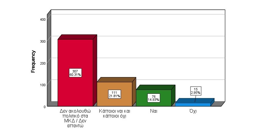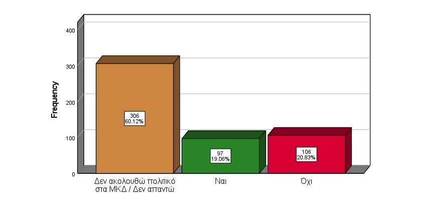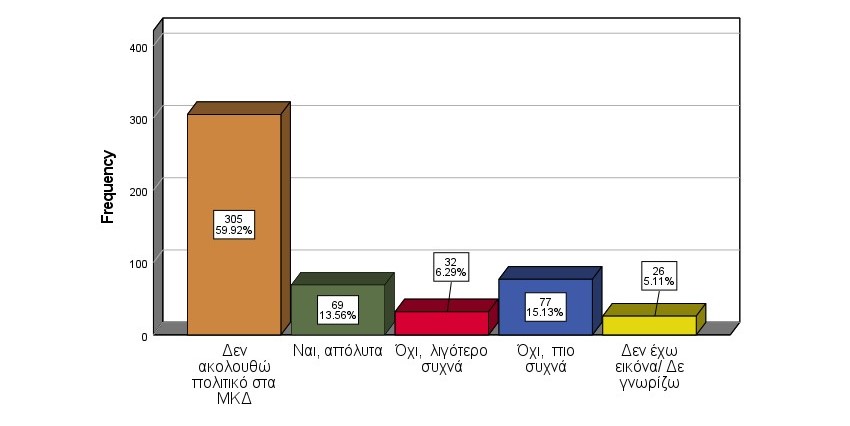 Οι 203 ή το 39.88% των συμμετεχόντων «ακολουθούν» τουλάχιστον έναν πολιτικό στα ΜΚΔ και οι 270, δηλαδή το 53.05% όχι. Επίσης, οι 36 δηλαδή το 7.07% του συνολικού δείγματος, είτε δεν απάντησαν στο ερώτημα, είτε δεν έχουν λογαριασμό στα ΜΚΔ