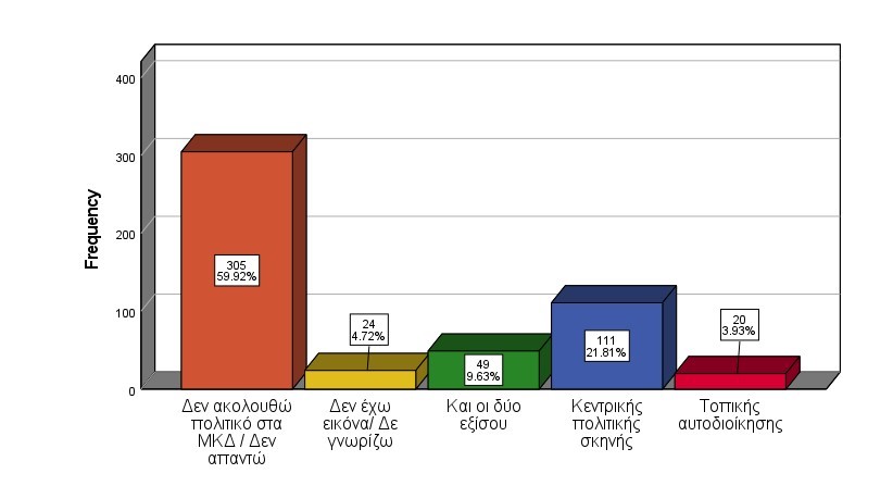 Οι 305 συμμετέχοντες ή το 59.92% του συνολικού δείγματος είτε δεν απάντησαν στο ποιοι χειρίζονται καλύτερα τα ΜΚΔ, οι πολιτικοί της κεντρικής πολιτικής σκηνής ή της τοπικής αυτοδιοίκησης, είτε δεν ακολουθούν πολιτικό στα ΜΚΔ. Από όσους απάντησαν οι 111 ή το 21.81% πιστεύουν ότι καλύτερα χειρίζονται τα ΜΚΔ οι πολιτικοί της Κεντρικής πολιτικής σκηνής, οι 20 ή το 3.93% πιστεύουν ότι καλύτερα χειρίζονται τα ΜΚΔ οι πολιτικοί της Τοπικής Αυτοδιοίκησης, οι 49 ή το 9.63% απάντησε ότι οι δύο κατηγορίες πολιτικών χειρίζονται τα ΜΚΔ το ίδιο καλά και οι 24 με ποσοστό 4.72% δεν εξέφρασαν άποψη.