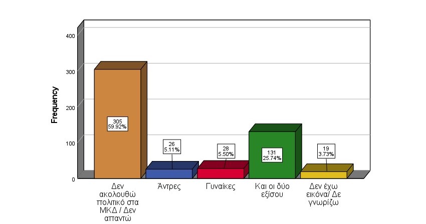 Το 60% περίπου των συμμετεχόντων στην έρευνα, είτε δεν διαθέτει λογαριασμό, είτε δεν «ακολουθεί» πολιτικούς στα ΜΚΔ. Το ποσοστό αυτό είναι αρκετά υψηλό, ιδιαίτερα συγκρινόμενο με τα αντίστοιχα χωρών του Δυτικού κόσμου. Οι περισσότεροι από τους συμμετέχοντες στην έρευνα που «ακολουθούν» πολιτικούς στα ΜΚΔ είναι άνδρες με ποσοστό 54.7%, ενώ στην αρχική κατανομή του δειγματικού μας χώρου υπερτερούσαν οι γυναίκες με ποσοστό 54.22%. Παρατηρούμε επομένως ότι, παρότι η χρήση των ΜΚΔ ως εργαλείο πολιτικής επικοινωνίας κερδίζει έδαφος σε πολλές χώρες του Δυτικού κόσμου και ιδιαίτερα στην Αμερική, το μεγαλύτερο ποσοστό των συμμετέχοντων στην έρευνά μας επιλέγει να μην ακολουθεί κάποιον πολιτικό.