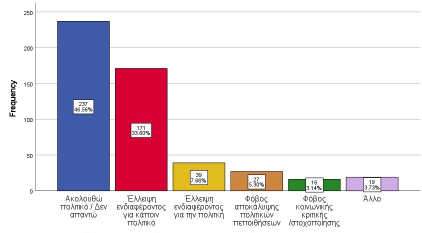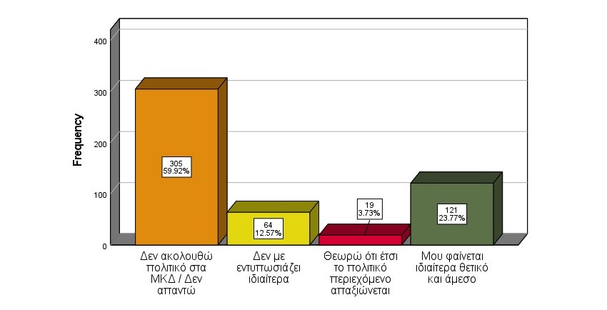 Οι 237 ή το 46.56% του συνόλου είτε «ακολουθούν» πολιτικό στα ΜΚΔ είτε δεν απάντησαν ποιος είναι ο κύριος λόγος που δεν «ακολουθούν» πολιτικούς στα ΜΚΔ. Από τους υπόλοιπους, οι 171 ή το 33.60% ανέφερε ως κύριο λόγο μη ακολουθίας την έλλειψη ενδιαφέροντος για κάποιον πολιτικό, οι 39 ή το 7.66% ότι δεν ενδιαφέρεται για την πολιτική γενικότερα, οι 27 ή το 5.30% δεν «ακολουθεί» πολιτικούς στα ΜΚΔ από φόβο αποκάλυψης των πολιτικών του πεποιθήσεων, οι 16 δηλαδή το 3.14% από φόβο κοινωνικής κριτικής ή στοχοποίησης και 19 ή το 3.73% για διάφορους λόγους, που παρουσιάζονται ομαδοποιημένοι δεδομένου ότι εμφάνισαν πολύ μικρή συχνότητα.
