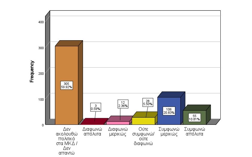 Οι 305 συμμετέχοντες ή το 59.92% του συνολικού δείγματος είτε δεν απάντησαν στο εάν θεωρούν ότι η χρήση των μέσων κοινωνικής δικτύωσης από τους πολιτικούς συμβάλλει στην ενεργό συμμετοχή των πολιτών στα κοινά, είτε δεν ακολουθούν πολιτικό στα ΜΚΔ. Από τους υπόλοιπους, οι 55 ή το 10.81% συμφωνούν απόλυτα με την άποψη ότι η χρήση των ΜΚΔ από του πολιτικούς συμβάλλει στην ενεργό συμμετοχή των πολιτών στα κοινά, οι 106 ή το 20.83% συμφωνούν μερικώς, οι 28 με ποσοστό 5.50% ούτε συμφωνούν ούτε διαφωνούν, οι 12 ή το 2.36% :διαφωνούν μερικώς και οι 3 ή το 0.59% διαφωνούν απόλυτα.