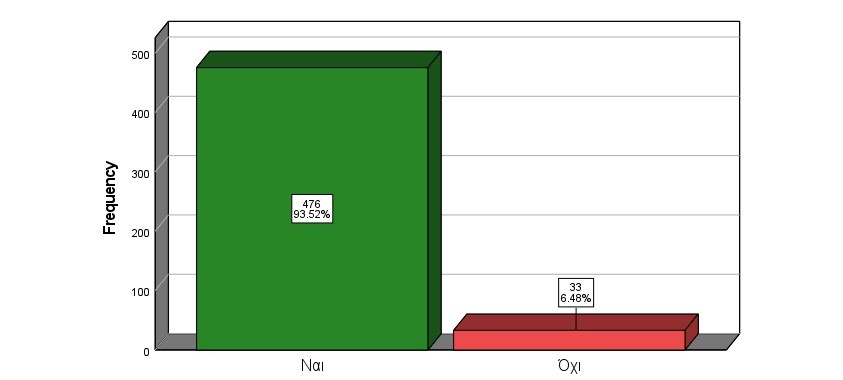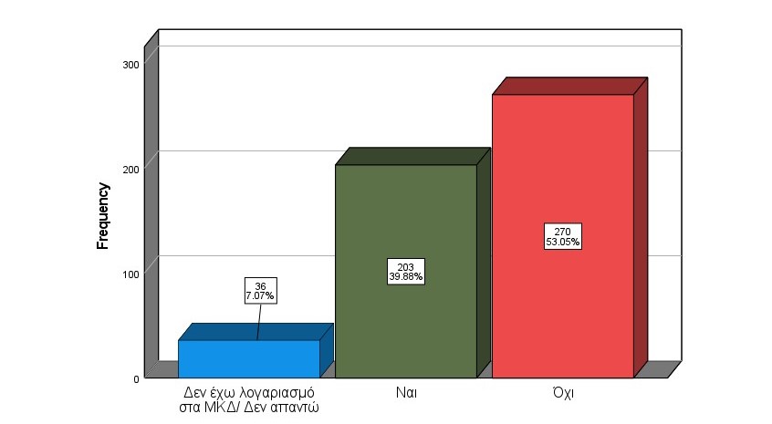 Οι 476 ή το 93.52% του δείγματος διαθέτουν λογαριασμό στα Μέσα Κοινωνικής Δικτύωσης, ενώ το 6.48% που αντιπροσωπεύει 33 άτομα, όχι.