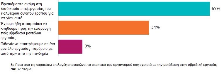 Έτσι, η πραγματική πρόκληση για τους ειδησεογραφικούς οργανισμούς φαίνεται να είναι η διαχείριση της μετάβασης από την υποχρεωτική εξ αποστάσεως εργασία στην υβριδική εργασία. Ενώ το ένα τρίτο (34%) των ερωτηθέντων αναφέρει ότι οι οργανισμοί τους έχουν ήδη αποφασίσει σημαντικές αλλαγές προς την εφαρμογή ενός υβριδικού μοντέλου εργασίας, περισσότεροι από τους μισούς (57%) δηλώνουν ότι βρίσκονται ακόμη στη διαδικασία επεξεργασίας του καλύτερου δυνατού τρόπου για να γίνει αυτό.