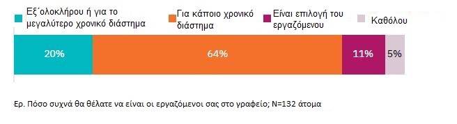 Ωστόσο, το ένα πέμπτο (20%) των ερωτηθέντων δήλωσε ότι θα ήθελε οι εργαζόμενοι να επιστρέψουν εξολοκλήρου ή για το μεγαλύτερο χρονικό διάστημα στο γραφείο. Αυτό το ποσοστό, μαζί με το προαναφερθέν 9% των ερωτηθέντων που δήλωσαν ότι επιθυμούν να επιστρέψουν σε ένα μοντέλο εργασίας παρόμοιο με αυτό πριν από την πανδημία, φανερώνει ότι ορισμένα διευθυντικά στελέχη παραμένουν επιφυλακτικά ή ακόμη και «εχθρικά» σε αυτές τις αλλαγές, ανησυχώντας ίσως για την πιθανές απώλειες στην αποτελεσματικότητα των ειδησεογραφικών οργανισμών.
