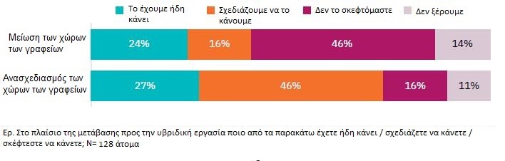 Την ίδια στιγμή η κρίση του COVID-19 έχει προκαλέσει συζητήσεις σχετικά και με τον ρόλο της αίθουσας σύνταξης. Ορισμένοι βλέπουν το γραφείο ολοένα και περισσότερο ως το κέντρο / πυρήνα της συνεργασίας μεταξύ των συναδέλφων, ενώ για άλλους η αίθουσα σύνταξης πρέπει να συνεχίζει να αντιπροσωπεύει το πνεύμα της εταιρείας, ακόμα κι αν χρειαστεί να αλλάξει η διαμόρφωση της. Σύμφωνα με τα στοιχεία της συγκεκριμένης έρευνας το ένα τέταρτο (27%) των ερωτηθέντων δηλώνει ότι έχει ήδη ανασχεδιάσει τους χώρους γραφείων και το 46% πως σχεδιάζει να το κάνει. Ένα άλλο τέταρτο (24%) έχει ήδη μειώσει τον όγκο των χώρων γραφείων, με το 16% να θέλει να το κάνει στο εγγύς μέλλον.
