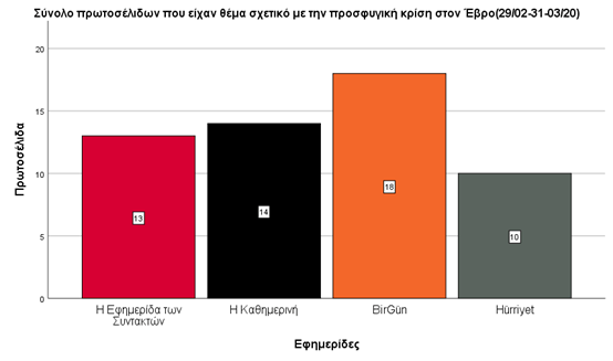 Το γεγονός ότι, παρόλο που ήταν μία κρίσιμη περίοδος για τον τομέα της υγείας, η κρίση στον Έβρο βρέθηκε για αρκετές ημέρες στο πρωτοσέλιδο των εφημερίδων του δείγματος και των δύο χωρών, δεν είναι αμελητέο. Περισσότερες μέρες σχετικό θέμα εμφανίστηκε στην εφημερίδα BirGün (18) και λιγότερες στην Hürriyet (10). Οι ελληνικές εφημερίδες είχαν σχεδόν παρόμοια αποτελέσματα.