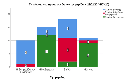 Πιο αναλυτικά, διαπιστώθηκε ότι οι εφημερίδες με πιο συντηρητικό πολιτικό προσανατολισμό και στις δύο χώρες (Η Καθημερινή, Hürriyet) χρησιμοποιούσαν κατά κύριο λόγο το «πλαίσιο σύγκρουσης» στα θέματα που αφορούσαν την προσφυγική κρίση στον Έβρο, ενώ οι εφημερίδες με αριστερό προσανατολισμό δεν ταυτίζονταν ως προς το πλαίσιο που κυριαρχούσε στα πρωτοσέλιδά τους. Στην περίπτωση της Εφημερίδας των Συντακτών κυριαρχούσε το «πλαίσιο ευθύνης», ενώ στην αντίστοιχη περίπτωση της Τουρκίας (BirGün) κυριαρχούσε το «πλαίσιο ανθρώπινου ενδιαφέροντος». Η ελληνική αριστερή εφημερίδα «έκρινε» τις επιλογές της κυβέρνησής της, ενώ η τουρκική αυτοαποκαλούμενη ως ανεξάρτητη εφημερίδα απέφευγε να μιλήσει για ευθύνες και επικεντρωνόταν στην επίκληση στο συναίσθημα, προβάλλοντας ανθρώπινες ιστορίες προσφύγων και μεταναστών.