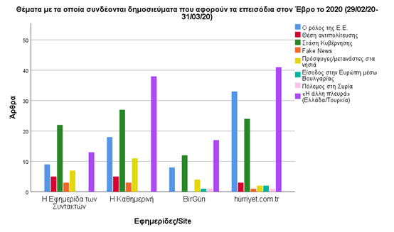 Η Καθημερινή, το hurriyet.com.tr αλλά και η και η BirGün συνδέουν σε μεγάλο βαθμό την προσφυγική κρίση στον Έβρο με την στάση του «άλλου» (Ελλάδα-Τουρκία), στον οποίο ασκούν έντονη κριτική σε πολλές περιπτώσεις. Η Εφημερίδα των Συντακτών, από την άλλη πλευρά συνδέει τις περισσότερες φορές την προσφυγική-μεταναστευτική κρίση με τη στάση της κυβέρνησης.