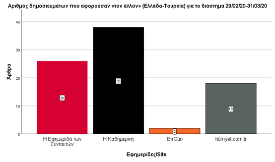Η Εφημερίδα των Συντακτών συνολικά από τις 29/02/2020 έως τις 31/03/2020 δημοσίευσε 26 κείμενα που σχετίζονται με τον «άλλον» (αλλά όχι άμεσα με τις ελληνοτουρκικές σχέσεις). Για το ίδιο χρονικό διάστημα, η Καθημερινή δημοσίευσε 38 κείμενα, η BirGün 2 και το hurriyet.con.tr 18.