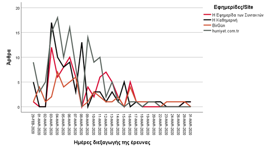 Η Εφημερίδα των Συντακτών συνολικά από τις 29/02/2020 έως τις 31/03/2020 δημοσίευσε 26 κείμενα που σχετίζονται με τον «άλλον» (αλλά όχι άμεσα με τις ελληνοτουρκικές σχέσεις). Για το ίδιο χρονικό διάστημα, η Καθημερινή δημοσίευσε 38 κείμενα, η BirGün 2 και το hurriyet.con.tr 18.