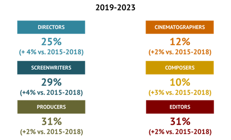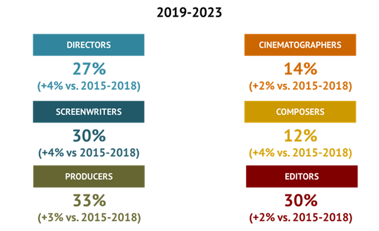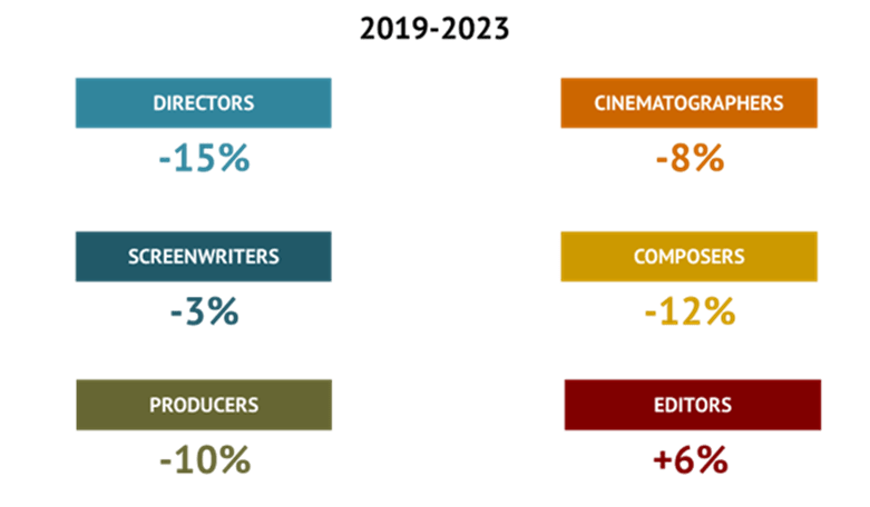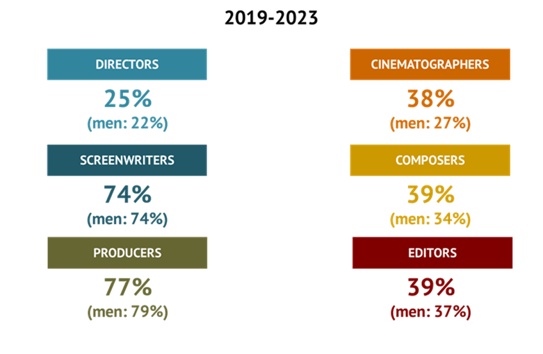 Μεταξύ 2019 και 2023, το ποσοστό των γυναικών ήταν περίπου 30% για τους παραγωγούς, τους μοντέρ, τους σεναριογράφους και τους σκηνοθέτες, και 12% για τους κινηματογραφιστές και 10% για τους συνθέτες.