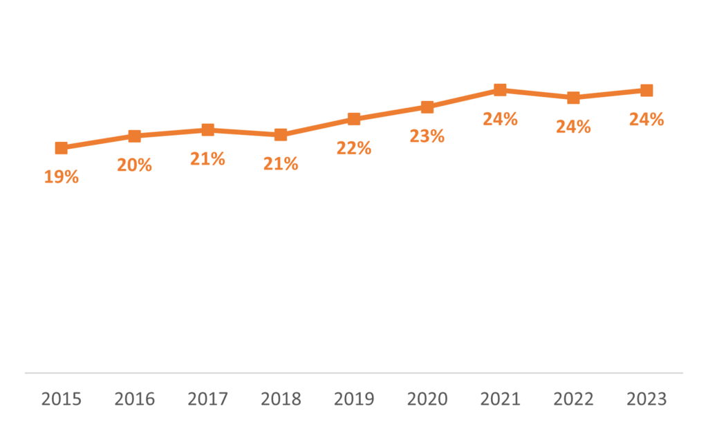 Γράφημα 1: Ποσοστό γυναικών σε αναθέσεις παραγωγής ταινιών, όλοι οι ρόλοι μαζί (2015-2023) *