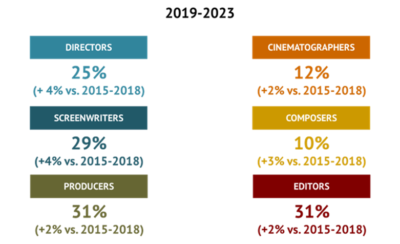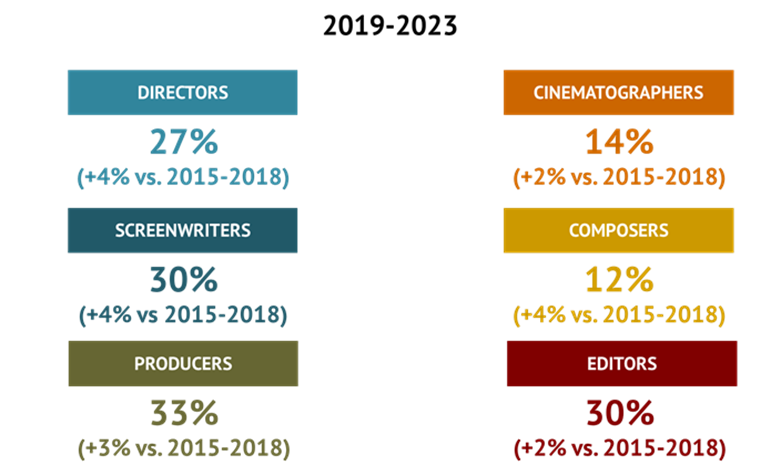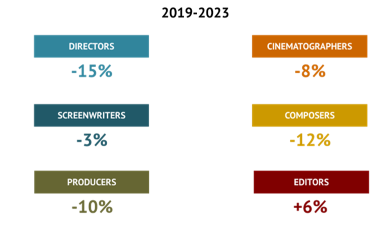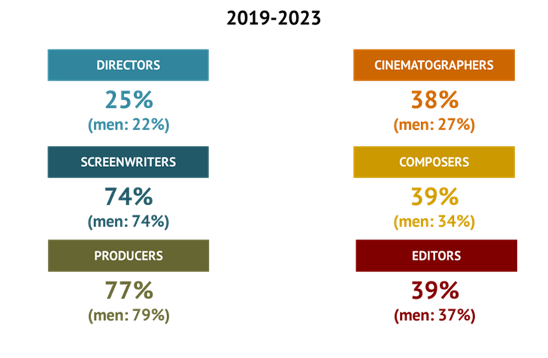 Μεταξύ 2019 και 2023, το ποσοστό των γυναικών ήταν περίπου 30% για τους παραγωγούς, τους μοντέρ, τους σεναριογράφους και τους σκηνοθέτες, και 12% για τους κινηματογραφιστές και 10% για τους συνθέτες.