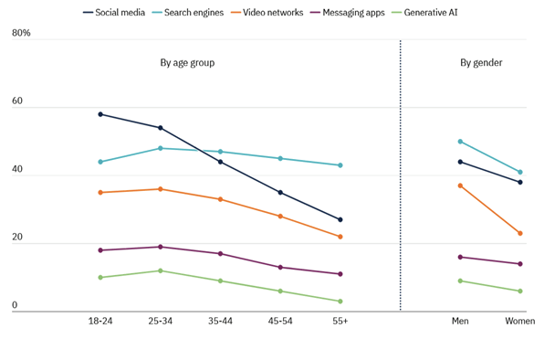 Στις οκτώ χώρες που εξέτασαν, οι μηχανές αναζήτησης είναι η πιο διαδεδομένη πλατφόρμα για ενημέρωση (45%), ακολουθούμενη από τα μέσα κοινωνικής δικτύωσης (41%) και τα δίκτυα βίντεο (30%). Οι εφαρμογές ανταλλαγής μηνυμάτων (15%) και η δημιουργική τεχνητή νοημοσύνη (7%) δεν χρησιμοποιούνται ευρέως για το σκοπό αυτό.