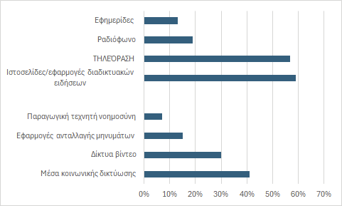 Οι διαδικτυακοί ιστότοποι και οι ειδησεογραφικές εφαρμογές (59%) και η τηλεόραση (57%) εξακολουθούν να χρησιμοποιούνται ευρύτερα από οποιονδήποτε μεμονωμένο τύπο πλατφόρμας.